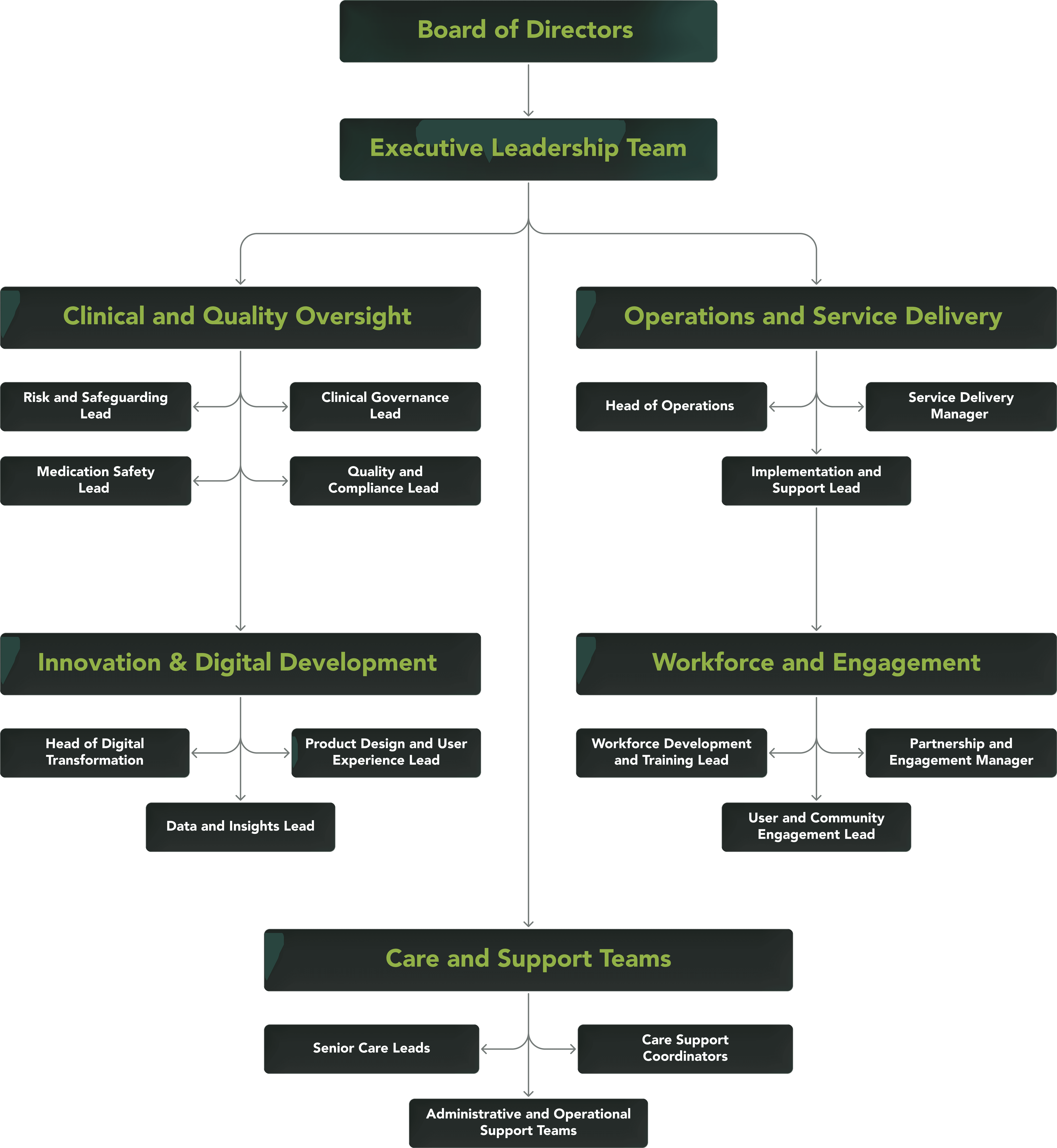 Our organisational design reflects best practice standards in governance, clinical safety, operational excellence and digital innovation. Rather than listing individual names, we present the roles that drive the organisation forward, ensuring transparency, high accountability and strong sector alignment.